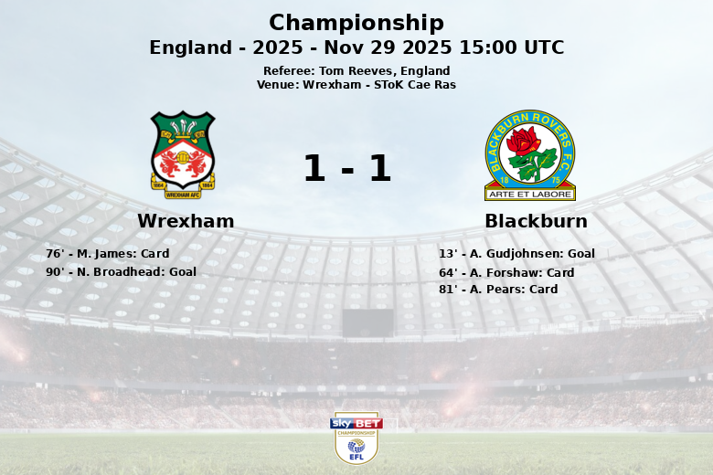 Wrexham, Inglaterra – En un encuentro cargado de intensidad en el SToK Cae Ras, el Wrexham y el Blackburn Rovers firmaron un empate que dejó a los aficionados al borde de sus asientos. El Blackburn se adelantó temprano, al minuto 13, con un gol de A. Gudjohnsen tras una precisa asistencia de R. Alebiosu.