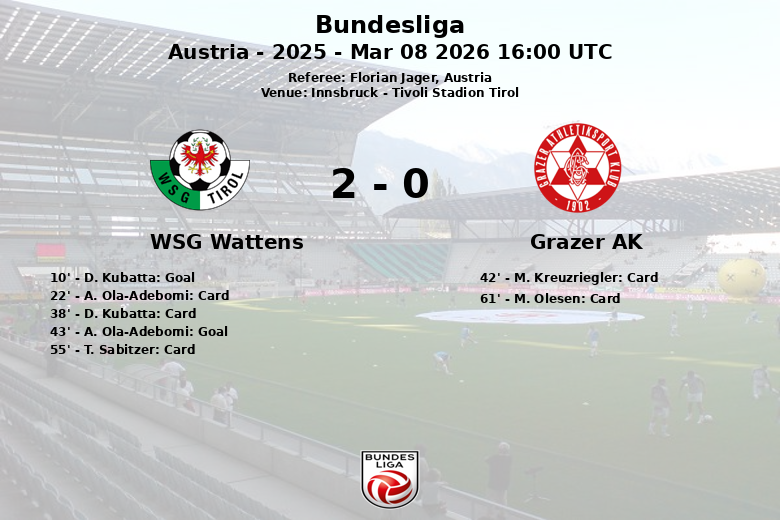 La primera mitad se caldeó con una tarjeta amarilla para A. Ola-Adebomi del Wattens al minuto 22 y otra para D. Kubatta al 38. Justo antes del descanso, M. Kreuzriegler del Grazer AK vio la tarjeta roja, dejando a su equipo con diez hombres. El Wattens aprovechó la superioridad numérica y A. Ola-Adebomi amplió la ventaja al minuto 43, asistido por L. Sulzbacher.