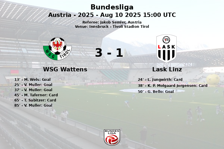 El partido estuvo marcado por una alta intensidad y varias amonestaciones. El LASK Linz acumuló dos tarjetas amarillas (L. Jungwirth y K. P. Molgaard Jorgensen), mientras que el WSG Wattens vio a M. Taferner y T. Sabitzer recibir la misma sanción. A pesar de la posesión del balón favorable al LASK Linz, el WSG Wattens fue más peligroso en ataque, con 18 tiros totales frente a los 9 de su rival. La victoria consolida al WSG Wattens en el inicio de la temporada.