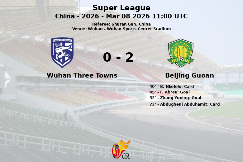 Wuhan, China – Beijing Guoan se impuso con autoridad a Wuhan Three Towns en el partido inaugural de la Super League 2026, celebrado en el Wuhan Sports Center Stadium. El equipo de Beijing controló el partido con un 68% de posesión, demostrando su superioridad en el campo. A pesar de la resistencia inicial de Wuhan, el Guoan logró abrir el marcador justo antes del descanso con un gol de F. Abreu al minuto 45, asistido por Wang Gang.