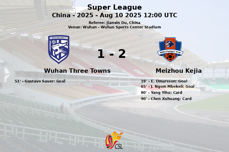 El Meizhou Kejia se adelantó en el marcador al minuto 19 gracias a un gol de E. Omarsson, asistido por J. Ngom Mbekeli. El Wuhan Three Towns, dominando la posesión con un 68%, buscó insistentemente el empate, que finalmente llegó al minuto 51 a través de Gustavo Sauer.