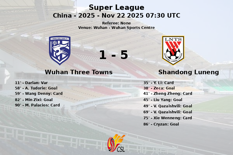 Wuhan, China – En un emocionante encuentro disputado en el Wuhan Sports Centre, Shandong Luneng demostró su superioridad al vencer a Wuhan Three Towns con un marcador final de 5-2. El partido, correspondiente a la ronda 30 de la Super League China 2025, estuvo marcado por goles, tarjetas y controversia.