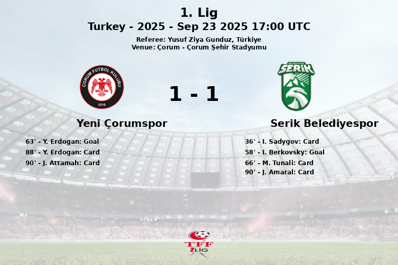 El Serik Belediyespor se adelantó en el marcador al minuto 58 con un gol de I. Berkovsky, sin asistencia. Sin embargo, el Yeni Çorumspor respondió al minuto 63 con un tanto de Y. Erdogan, asistido por D. Aleksic, igualando el marcador.