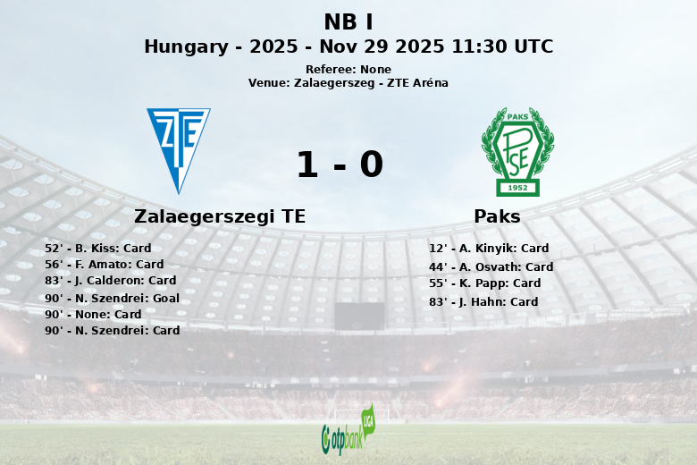 Zalaegerszeg, Hungría – En un partido cargado de tensión y tarjetas amarillas, el Zalaegerszegi TE logró una agónica victoria sobre el Paks en el ZTE Aréna. A pesar de que el Paks mostró solidez defensiva durante gran parte del encuentro, el Zalaegerszegi TE dominó la posesión con un 52% y generó un mayor número de oportunidades de gol, totalizando 17 tiros frente a los escasos 3 del Paks. Sin embargo, la falta de puntería y la buena defensa del Paks mantuvieron el marcador en cero durante la mayor parte del encuentro. El partido se caracterizó por un juego físico, evidenciado por las numerosas faltas cometidas por ambos equipos (11 del Zalaegerszegi TE y 16 del Paks) y las siete tarjetas amarillas mostradas. Cuando parecía que el empate sin goles era inevitable, N. Szendrei, asistido por B. Varkonyi, anotó en el minuto 90, desatando la euforia en el estadio y asegurando los tres puntos para el Zalaegerszegi TE. El Zalaegerszegi TE con siete tiros a puerta logró concretar el gol de la victoria, mientras que Paks solo logro un tiro a puerta en todo el partido.