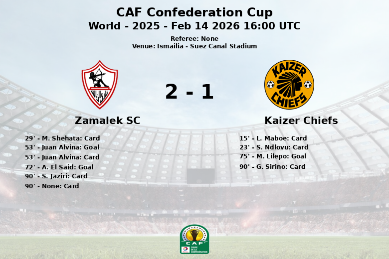 La segunda mitad fue mucho más dinámica. Juan Alvina abrió el marcador para el Zamalek SC en el minuto 53, tras una asistencia de N. Mansy. El propio Alvina fue amonestado inmediatamente después. Zamalek SC extendió su ventaja en el minuto 72 con un gol de A. El Said, asistido por M. Hamad. El Kaizer Chiefs respondió rápidamente en el minuto 75, cuando M. Lilepo anotó con asistencia de L. Maboe, acortando distancias en el marcador.