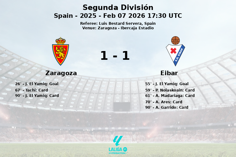 A pesar de tener menor posesión (43% frente al 57% del Eibar), el Zaragoza generó más ocasiones de gol, con 12 tiros totales frente a los 4 del Eibar. Sin embargo, la falta de puntería y el autogol sentenciaron el empate final. El árbitro del partido, Luis Bestard Servera, tuvo una noche ajetreada, mostrando un total de 6 tarjetas amarillas y una roja.