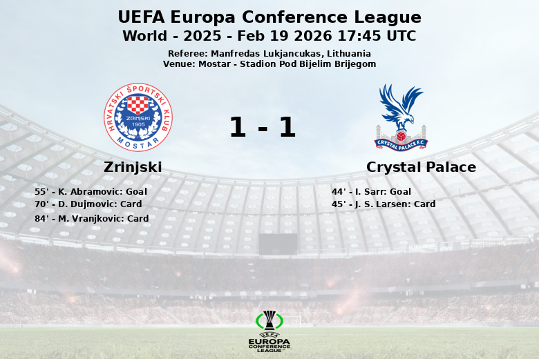 El Crystal Palace abrió el marcador al minuto 44 con un gol de I. Sarr tras una asistencia de J. S. Larsen. El Zrinjski respondió en la segunda mitad, al minuto 55, con un tanto de K. Abramovic asistido por L. Mikic, nivelando el marcador. El partido fue intenso en la zona media, reflejado en las 11 faltas cometidas por el Crystal Palace y las 9 del Zrinjski. La disciplina también estuvo presente, con una tarjeta amarilla para J. S. Larsen del Crystal Palace y dos para el Zrinjski, a D. Dujmovic y M. Vranjkovic. A pesar del dominio en la posesión y los intentos ofensivos del Crystal Palace, el Zrinjski supo defender su terreno y aprovechar sus oportunidades, sellando un empate que deja la eliminatoria abierta para el partido de vuelta. El árbitro del encuentro, Manfredas Lukjancukas de Lituania, tuvo una actuación discreta en un partido con mucha disputa.