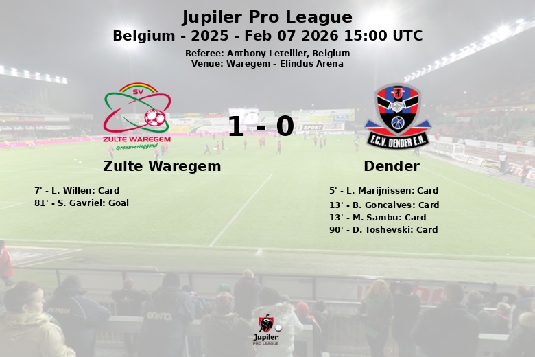 El gol decisivo llegó al minuto 81, cuando S. Gavriel, asistido por A. Ementa, logró batir al portero del Dender. A pesar de los esfuerzos del Dender por igualar el marcador en los minutos finales, el Zulte Waregem consiguió mantener la ventaja y asegurar los tres puntos en casa. El partido concluyó con 6 corners para el Zulte Waregem y 1 para el Dender, además de 9 faltas cometidas por cada equipo.