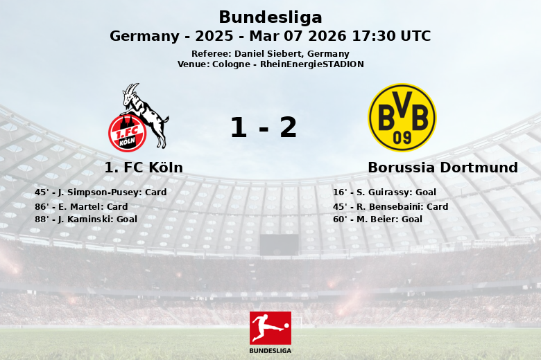 Le match a commencé par un but précoce de S. Guirassy pour le Borussia Dortmund à la 16e minute, sur une passe de M. Beier. Cologne, malgré ses efforts, a été handicapé par l’expulsion de J. Simpson-Pusey juste avant la mi-temps. R. Bensebaini de Dortmund a également reçu un carton jaune avant la fin de la première mi-temps.
