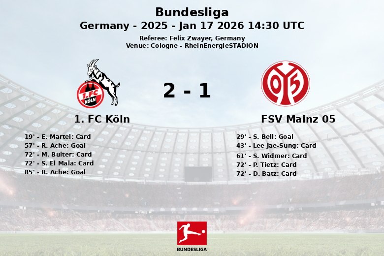 Cologne, Allemagne – Dans un match palpitant disputé au RheinEnergieSTADION, le FC Cologne a décroché une victoire importante contre le FSV Mainz 05 lors de la 18ème journée de Bundesliga. Le match, arbitré par Felix Zwayer, a été marqué par l’intensité et une bataille constante au milieu de terrain.