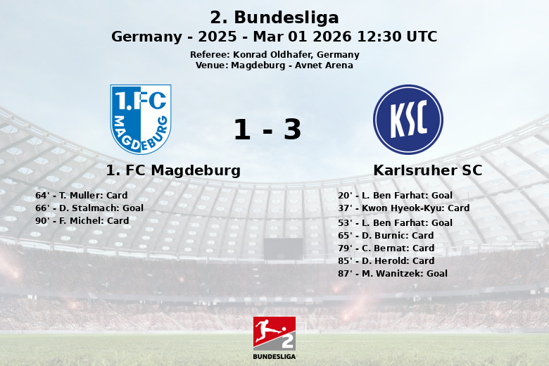 Magdeburg, Allemagne – Dans un match disputé à l’Avnet Arena, le Karlsruher SC a réussi à vaincre le 1. FC Magdeburg sur le score de 3 à 1 lors de la 24e journée de la 2. Bundesliga. Le match, arbitré par Konrad Oldhafer, a été marqué par l’intensité et les cartons.