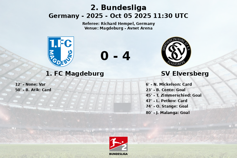 En seconde période, L. Petkov d’Elversberg et B. Atik de Magdeburg ont reçu des cartons jaunes. Elversberg a continué à presser, et O. Stange a marqué le troisième but à la 74e minute. J. Malanga a scellé la victoire avec un quatrième but à la 80e minute, à nouveau assisté par B. Conte.