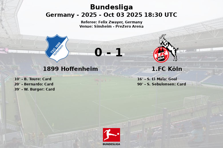 Sinsheim, Allemagne – Dans un match disputé à la PreZero Arena, le 1. FC Cologne a battu le 1899 Hoffenheim sur le score de 1 à 0. Le seul but du match est intervenu tôt, à la 16e minute, grâce à S. El Mala, qui a profité d’une passe décisive précise d’E. Martel.