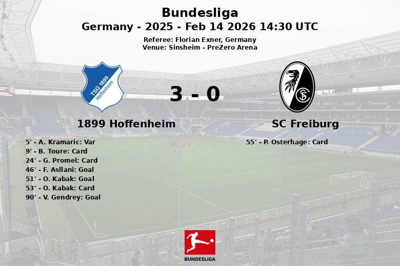 Le match a commencé de manière agitée, avec un but refusé à Kramaric à la 5ème minute pour hors-jeu après une révision du VAR. Toure et Promel ont reçu des cartons jaunes en première mi-temps. Cependant, la seconde mi-temps a été complètement différente. Asllani a ouvert le score pour Hoffenheim à la 46ème minute, sur une passe de Coufal, rapidement suivi par Kabak à la 51ème minute, également sur une passe de Coufal. Kabak a reçu un carton jaune peu de temps après. Osterhage de Fribourg a également été averti. Dans le temps additionnel, Gendrey a scellé la victoire pour Hoffenheim à la 90ème minute, sur une passe de Prass. Malgré les efforts de Fribourg, leur possession de 38% et le manque de précision de leurs tirs n’ont pas suffi à contrer la domination de Hoffenheim. L’arbitre Florian Exner a eu un après-midi chargé, distribuant plusieurs cartons jaunes et gérant la révision du VAR en début de match. Le match s’est terminé par une victoire nette pour Hoffenheim.