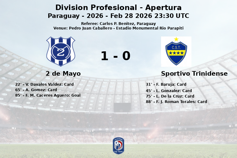Remplacements dans l’quipe de 2 de mayo: À la 18e minute, P. Sosa est entré et M. Barreto est sorti., À la 59e minute, O. Romero est entré et D. Acosta est sorti., À la 59e minute, A. Farina est entré et W. Ayala est sorti., À la 82e minute, P. Delvalle est entré et E. Alfonso est sorti., À la 82e minute, R. Ruiz Diaz est entré et F. M. Caceres Aguero est sorti.