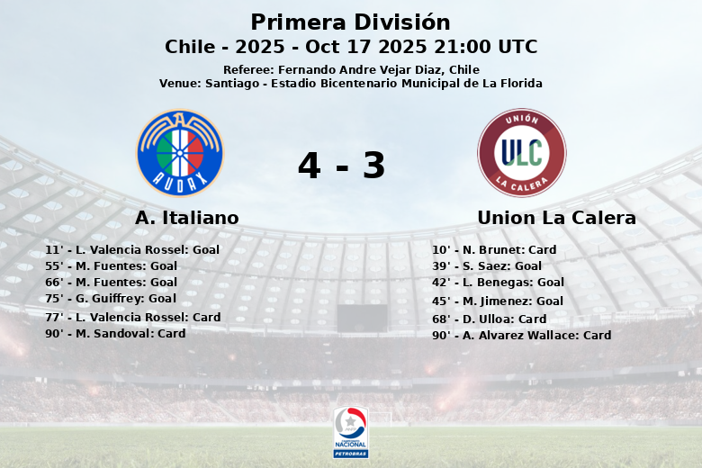 En ce qui concerne les statistiques, Unión La Calera a dominé la possession avec 66% contre 34% pour Audax Italiano. Cependant, Audax Italiano a été plus agressif en attaque, avec 17 tirs au total (7 cadrés) contre 10 tirs (4 cadrés) pour Unión La Calera. Le match a été marqué par l’intensité, avec plusieurs cartons jaunes distribués aux deux équipes. N. Brunet, D. Ulloa et A. Alvarez Wallace ont reçu un carton jaune pour Unión La Calera, tandis que L. Valencia Rossel et M. Sandoval ont été avertis pour Audax Italiano.
