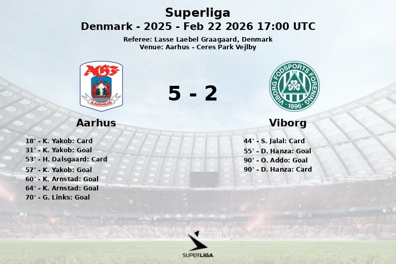 Aarhus a démontré sa supériorité dès le début, dominant la possession du ballon avec 56% contre 44% pour Viborg. K. Yakob a ouvert le score pour Aarhus à la 31e minute, sur une passe de T. Bech, après avoir reçu un carton jaune à la 18e minute. Viborg a reçu un carton jaune à la 44e minute. Viborg a répondu à la 55e minute avec un but de D. Hanza, sur une passe de C. Nouck, mais Aarhus n’a pas reculé et a rapidement repris l’avantage avec un but de K. Yakob à la 57e minute et un autre de K. Arnstad à la 60e minute. Arnstad a également transformé un penalty à la 64e minute. Le sixième but d’Aarhus est intervenu à la 70e minute par l’intermédiaire de G. Links. En fin de match, O. Addo de Viborg a marqué un but à la 90e minute.