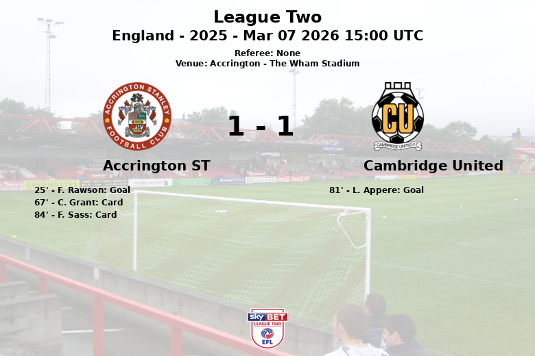 La persévérance de Cambridge United a finalement été récompensée à la 81e minute lorsque L. Appere a égalisé avec une passe décisive de K. Smith. Malgré leur domination territoriale et un plus grand nombre de corners (10 contre 0), Cambridge United a dû se contenter d’un match nul dans un match où l’efficacité d’Accrington Stanley a été essentielle pour maintenir le résultat.