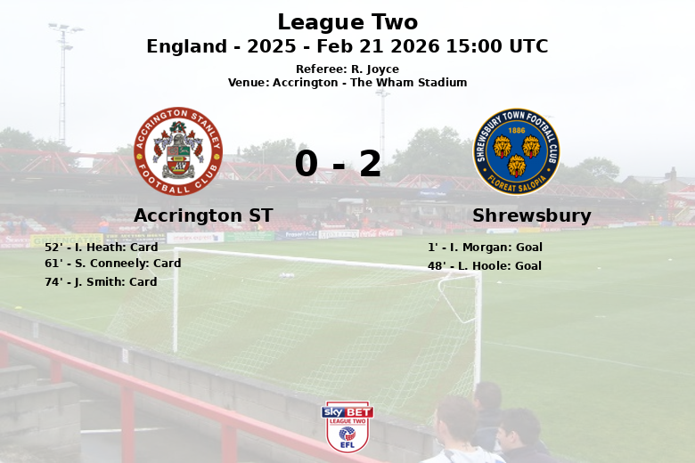 Accrington Stanley, malgré une domination de la possession de balle avec 60%, n’a pas réussi à concrétiser sa domination en buts. Les locaux ont tenté de réagir, en générant 10 tirs (5 cadrés et 4 non cadrés) et en obtenant 5 corners, mais la défense de Shrewsbury s’est montrée solide. La frustration était palpable dans le camp d’Accrington, accumulant 12 fautes et recevant trois cartons jaunes (I. Heath à la 52e minute, S. Conneely à la 61e minute et J. Smith à la 74e minute). Shrewsbury, quant à lui, a commis 7 fautes et n’a reçu aucun avertissement.