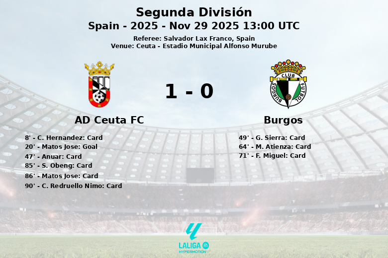Ceuta, Espagne – Dans une rencontre tendue et tactique, l’AD Ceuta FC a décroché une précieuse victoire à domicile face au Burgos CF, lors d’un match comptant pour la 16ème journée de Segunda División. Le seul but du match a été marqué à la 20ème minute, lorsque Matos Jose, servi par K. Kone, a percé les filets adverses, déclenchant l’euphorie à l’Estadio Municipal Alfonso Murube.