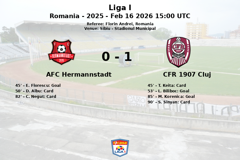 Le match s’est terminé par une victoire du CFR Cluj, qui, bien qu’ayant eu moins de possession (49 %), s’est montré plus efficace devant le but adverse. Hermannstadt, bien qu’ayant généré plus de tirs (12 contre 15 pour Cluj), n’a pas réussi à convertir ses occasions.