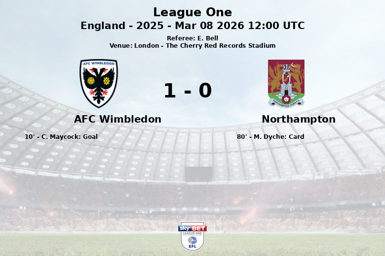 Londres, Angleterre – Lors d’un match disputé au Cherry Red Records Stadium, l’AFC Wimbledon a réussi à s’imposer face à Northampton, avec un score qui reflétait sa domination de la possession de balle. Le seul but du match est arrivé tôt, à la 10e minute, grâce à une excellente finition de C. Maycock, sur une passe décisive de M. Browne.