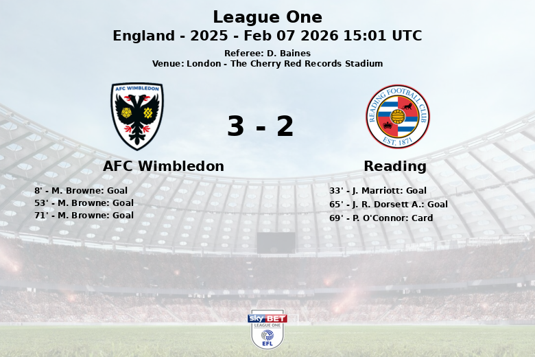 L’AFC Wimbledon a ouvert le score tôt, à la 8e minute, grâce à un but de M. Browne. Reading a répondu une demi-heure plus tard avec un but de J. Marriott, égalisant le score. En seconde période, l’AFC Wimbledon a repris l’avantage avec un autre but de M. Browne à la 53e minute. Cependant, Reading n’a pas abandonné et J. R. Dorsett A. a de nouveau égalisé à la 65e minute. La joie de Reading fut de courte durée, car M. Browne a complété son coup du chapeau à la 71e minute, assurant la victoire de l’AFC Wimbledon.