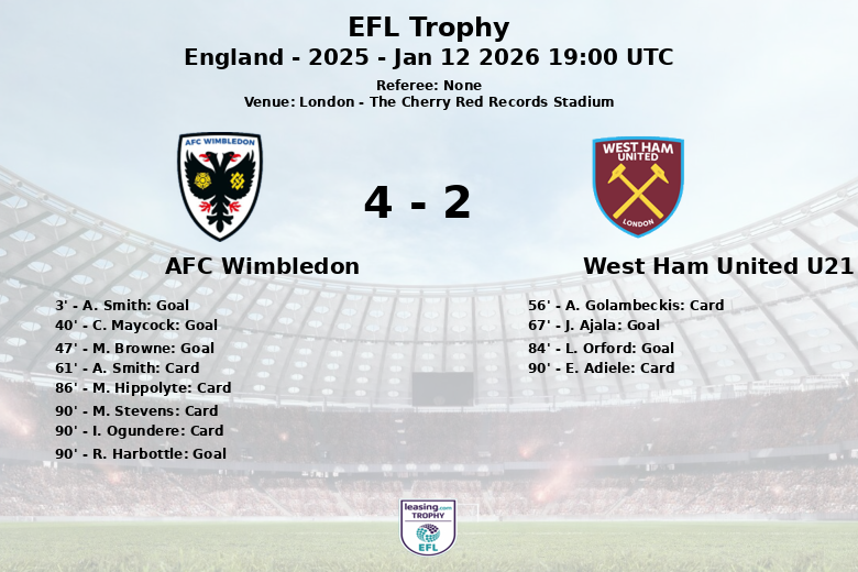 AFC Wimbledon a commencé fort, ouvrant le score à la 3ème minute avec un but de A. Smith, suivi d’un autre but de C. Maycock à la 40ème minute. Après la mi-temps, M. Browne a élargi leur avance à la 47ème minute. West Ham United U21 a répondu avec un but de J. Ajala à la 67ème minute, suivi d’un autre de L. Orford à la 84ème minute, mais cela n’a pas suffi à contrer la pression offensive de Wimbledon. R. Harbottle a scellé le match avec un but à la 90ème minute.