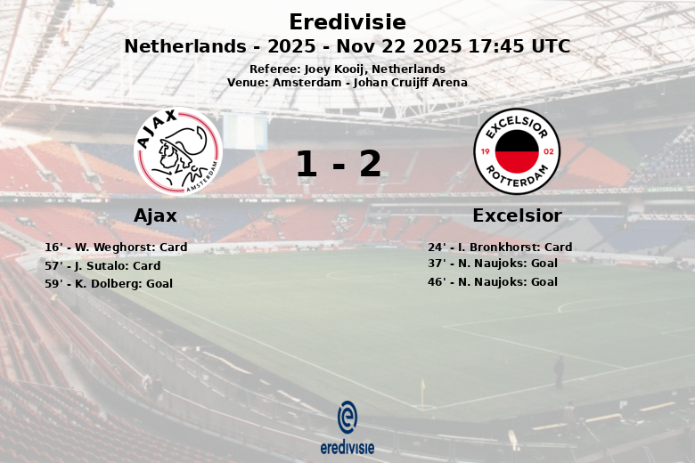 Malgré la domination territoriale de l’Ajax, qui affichait 64 % de possession de balle et a généré 14 tirs, Excelsior a su capitaliser sur ses occasions. À la 37e minute, N. Naujoks a ouvert le score avec une finition précise, suite à une passe décisive de R. Meissen. L’avance a été étendue au début de la seconde période, Naujoks célébrant à nouveau à la 46e minute.