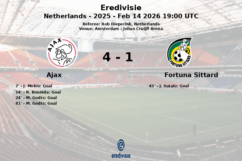Amsterdam, Pays-Bas – L’Ajax a remporté une victoire écrasante sur le Fortuna Sittard à l’Johan Cruijff Arena le 14 février 2026, lors d’un match correspondant à la 23e journée de l’Eredivisie. Dès le début, l’Ajax a imposé son rythme et contrôlé le jeu, comme en témoigne sa possession de balle de 56 %.