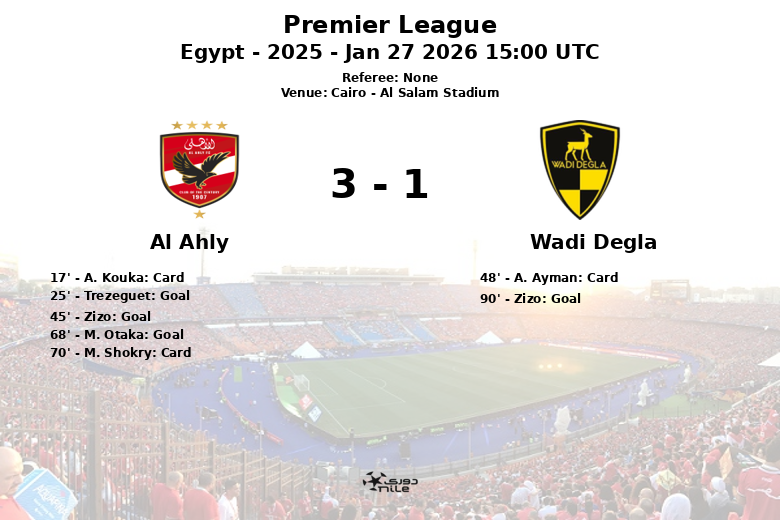 La deuxième mi-temps s’est poursuivie à un rythme élevé. Al Ahly a consolidé sa domination avec un but de M. Otaka à la 68e minute, assisté par E. Ashour. Wadi Degla a tenté de réagir, parvenant à marquer à la 90e minute grâce à un but de Zizo, mais il était trop tard pour modifier le cours du match.