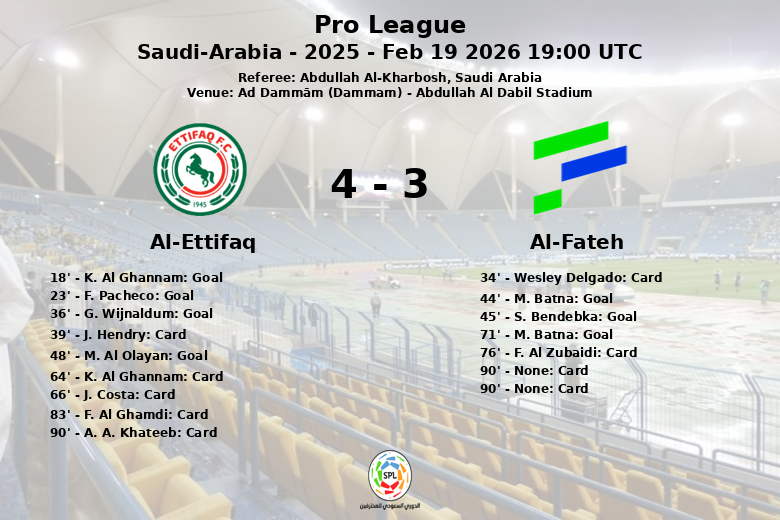 En seconde période, M. Al Olayan a redonné l’avantage à Al-Ettifaq à la 48e minute. Al-Fateh n’a pas abandonné, et M. Batna a marqué son deuxième but du match à la 71e minute. Le match a été marqué par l’intensité, reflétée par les nombreuses fautes et cartons jaunes adressés aux joueurs des deux équipes. Al-Ettifaq a eu 50% de la possession du ballon et a effectué 13 tirs, dont 5 cadrés. Al-Fateh, de son côté, a également eu 50% de la possession et a généré 15 tirs, dont 8 cadrés. L’arbitre Abdullah Al-Kharbosh a distribué un total de 7 cartons jaunes à Al-Ettifaq et 4 à Al-Fateh. La rencontre, correspondant à la 23e journée de la Pro League 2025, a mis en évidence l’esprit de compétition des deux équipes.