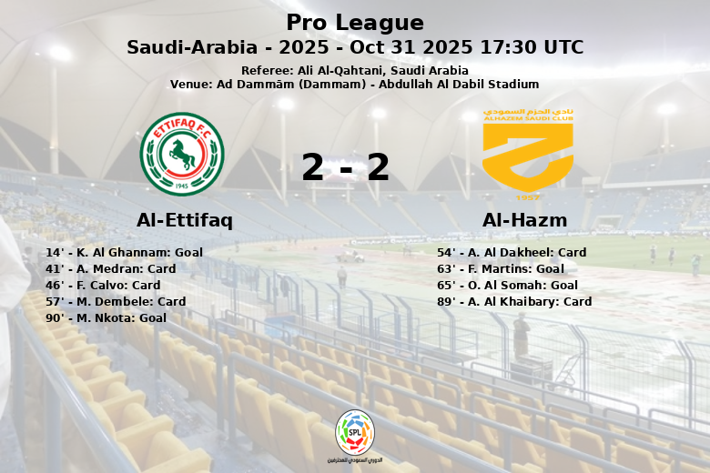 Ad Dammām (Dammam) – Dans un match acharné au Abdullah Al Dabil Stadium, Al-Ettifaq et Al-Hazm ont fait match nul dans une rencontre vibrante et pleine d’action. K. Al Ghannam a donné l’avantage à Al-Ettifaq à la 14e minute avec un but sur une passe décisive de M. Dembele. La première mi-temps a vu une possession de balle équitablement répartie et des cartons jaunes pour les deux équipes.