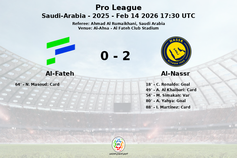 À la 80e minute, Abdulrahman Yahya a creusé l’écart pour Al-Nassr, consolidant la victoire. Al-Fateh, bien qu’avec une plus grande possession, n’a pas réussi à concrétiser ses occasions, avec 4 tirs cadrés. Al-Nassr, en revanche, a fait preuve d’une plus grande efficacité, avec 4 tirs cadrés sur ses 15 tentatives. Le match s’est terminé avec Al-Nassr commettant 17 fautes et recevant 2 cartons jaunes, tandis qu’Al-Fateh a commis 9 fautes et reçu un carton jaune.