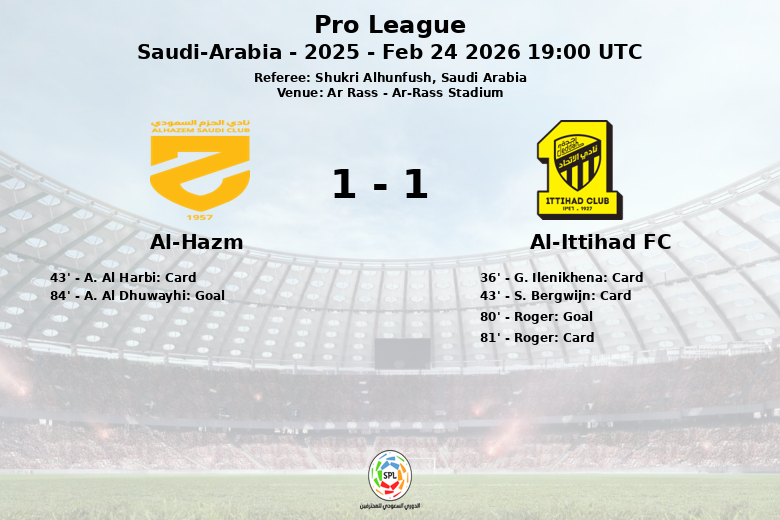 Le match a été caractérisé par un nombre élevé de fautes, 16 commises par Al-Ittihad et 11 par Al-Hazm, ce qui a entraîné un total de cinq cartons jaunes distribués par l’arbitre Shukri Alhunfush. La première mi-temps s’est terminée sans but, mais avec plusieurs avertissements.