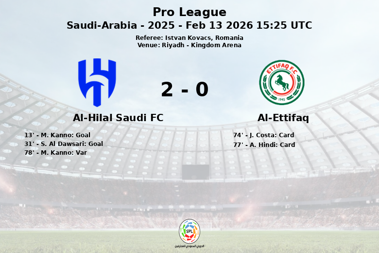 Al-Ettifaq a eu du mal à trouver des ouvertures, ne parvenant à réaliser que 9 tirs, dont seulement 2 cadrés. J. Costa et A. Hindi d’Al-Ettifaq ont reçu des cartons jaunes respectivement aux 74e et 77e minutes. Bien qu’Al-Ettifaq ait tenté de réagir avec plusieurs changements, ils n’ont pas réussi à créer des occasions claires pour réduire le déficit. Al-Hilal, avec un jeu solide et efficace, a remporté les trois points à domicile.