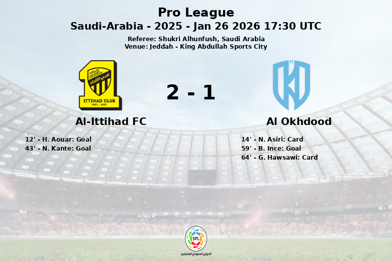 Al-Ittihad a ouvert le score à la 12e minute avec un but de H. Aouar, sur une passe décisive de N. Kante. Kante est redevenu le protagoniste en marquant le deuxième but pour son équipe à la 43e minute. Al Okhdood a écopé d’un carton jaune pour N. Asiri à la 14e minute et G. Hawsawi à la 64e minute.