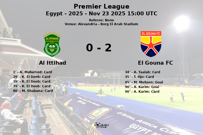 Alexandrie, Égypte – Le Borg El Arab Stadium a été témoin d’une victoire d’El Gouna FC sur Al Ittihad dans un match marqué par l’intensité et les cartons. Le match, correspondant à la 14e journée de la Premier League égyptienne, saison 2025, s’est terminé par un score qui reflète la capacité d’El Gouna FC à capitaliser sur les opportunités créées, même si la possession était relativement égale (52% pour El Gouna FC et 48% pour Al Ittihad).