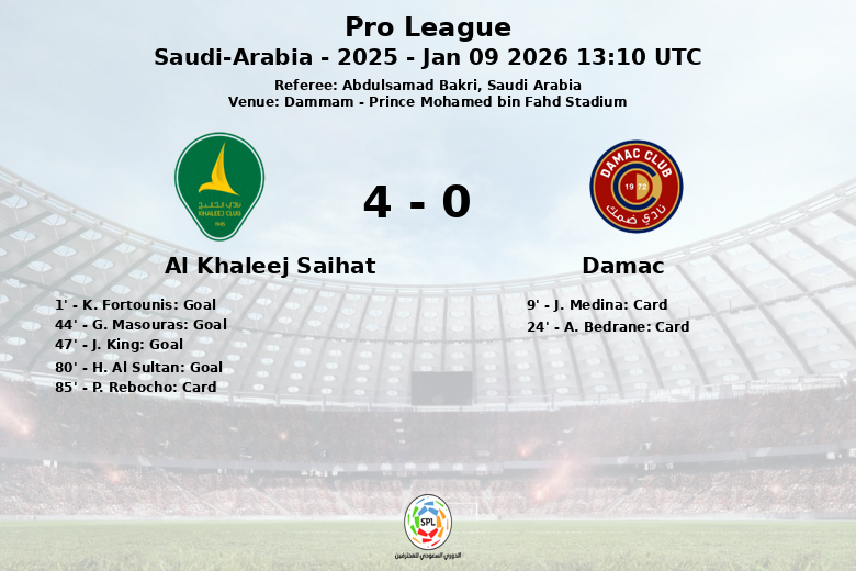 Le match s’est mis en place tôt pour Al Khaleej Saihat, avec un but de K. Fortounis à la 1ère minute, sur une passe de P. Rebocho. La situation s’est encore compliquée pour Damac lorsque A. Bedrane a reçu un carton rouge à la 24e minute, laissant son équipe à dix. Al Khaleej Saihat a profité de la supériorité numérique pour augmenter son avance avec des buts de G. Masouras à la 44e minute et J. King à la 47e minute. En deuxième mi-temps, H. Al Sultan a scellé la déroute à la 80e minute, après une passe de G. Masouras. Damac, avec seulement 33 % de possession et aucun tir cadré, n’a pas pu faire face à l’offensive de son rival. Le match a également été marqué par des cartons, avec un carton jaune pour Al Khaleej Saihat et un carton jaune et un carton rouge pour Damac.
