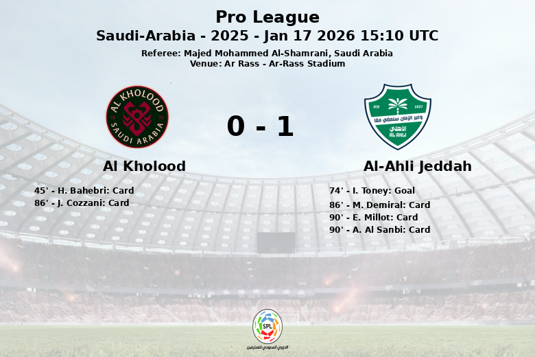 Ar Rass, Arabie Saoudite – Dans un match disputé au Stade Ar-Rass, sous le regard attentif de l’arbitre Majed Mohammed Al-Shamrani, Al-Ahli Jeddah a décroché une victoire difficile contre Al Kholood lors de la 16e journée de la Pro League. Le match, joué le 17 janvier 2026, a vu Al-Ahli Jeddah bénéficier d’un léger avantage en termes de possession (56% contre 44% pour Al Kholood), bien que les deux équipes aient fait preuve d’intensité dans leur quête de buts.