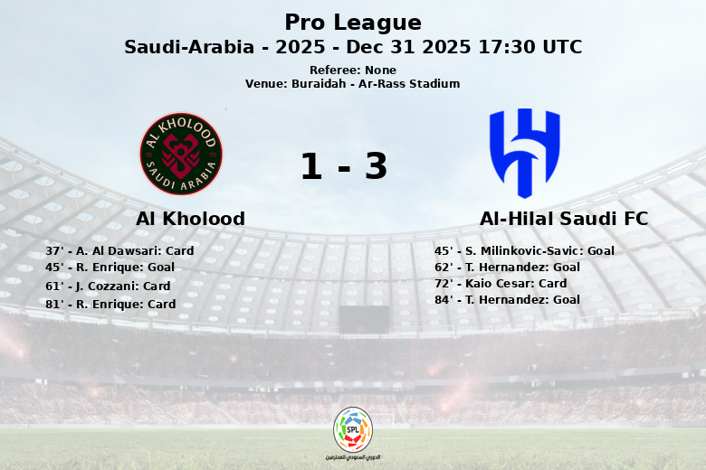En seconde période, Al-Hilal Saudi FC a consolidé sa domination avec deux buts de T. Hernandez (aux 62ème et 84ème minutes), qui s’est révélé être l’homme du match. Al-Hilal Saudi FC a affiché une maîtrise claire du jeu, conservant 65% de la possession et générant un total de 23 tirs, dont 9 cadrés. De son côté, Al Kholood, malgré ses efforts, n’a pu enregistrer que 35% de la possession et 11 tirs, dont seulement 4 dirigés vers le but adverse. Le match a été caractérisé par un jeu intense, reflété par les 11 fautes commises par Al Kholood et les 9 par Al-Hilal.