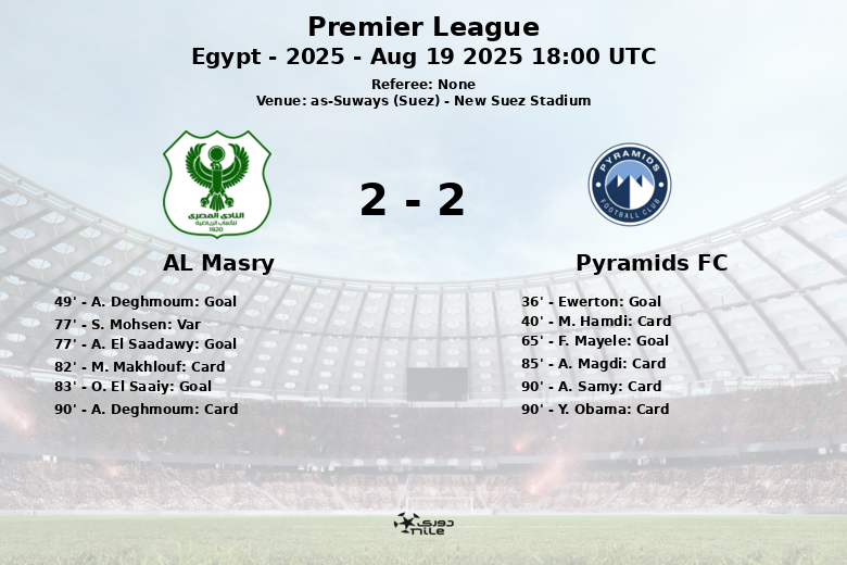 Ewerton a donné l’avantage à Pyramids FC à la 36e minute, mais Al Masry a répondu au début de la seconde période avec un but de A. Deghmoum à la 49e minute. Pyramids FC a repris l’avantage à la 65e minute avec un but de F. Mayele, servi par A. Atef. Le match est devenu dramatique dans la dernière ligne droite. Tout d’abord, un but de S. Mohsen pour Al Masry a été refusé après une consultation du VAR. Ensuite, A. El Saadawy a manqué un penalty à la 77e minute. Cependant, Al Masry a réussi à égaliser à la 83e minute avec un but de O. El Saaiy, suite à une passe décisive de A. Deghmoum, scellant un match nul qui laisse un goût amer pour les deux équipes. Le match, disputé le 19 août 2025 à Suez, a également été caractérisé par un jeu physique, avec 16 fautes commises par Pyramids FC et 11 par Al Masry. L’arbitre a montré quatre cartons jaunes aux joueurs de Pyramids FC et trois aux joueurs d’Al Masry.