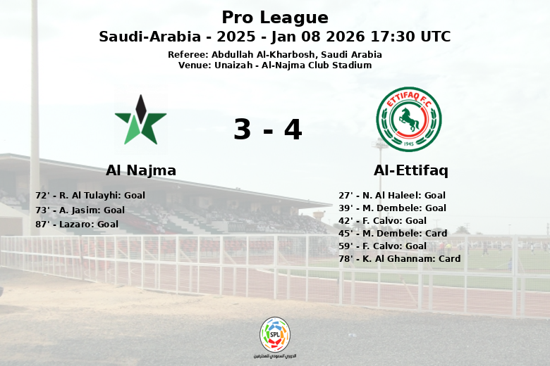 Al-Ettifaq a pris l’avantage grâce à un but contre son camp de N. Al Haleel à la 27e minute, suivi de buts de M. Dembele à la 39e minute et de F. Calvo à la 42e minute, grâce à une passe décisive de A. A. Khateeb, ce qui semblait ouvrir la voie à une victoire confortable. Calvo a de nouveau marqué à la 59e minute, aidé par une passe décisive de G. Wijnaldum, augmentant ainsi encore plus l’avance. Cependant, Al Najma a réagi avec force en deuxième mi-temps. R. Al Tulayhi a marqué à la 72e minute et A. Jasim a réduit l’écart à la 73e minute, ravivant les espoirs d’un retournement de situation. L’équipe locale a continué à pousser, et Lazaro a transformé un penalty à la 87e minute, mais cela n’a pas suffi à surmonter l’avance initiale d’Al-Ettifaq.