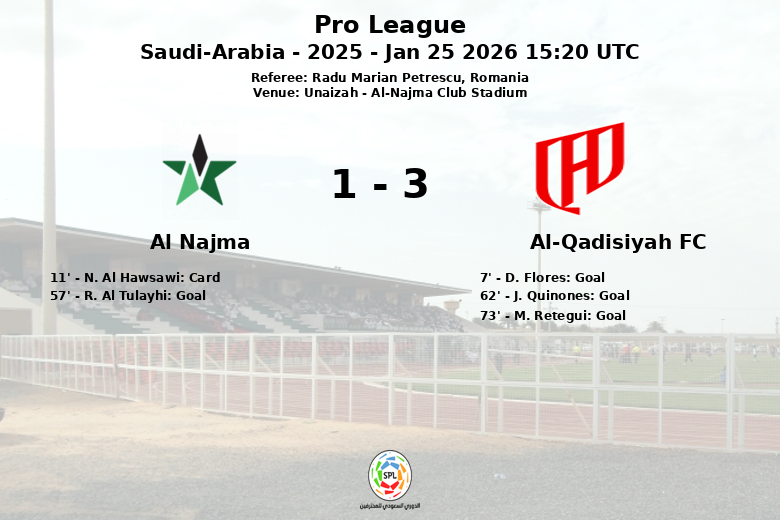 Unaizah, Arabie Saoudite – Al-Qadisiyah FC a vaincu Al Najma lors d’un match passionnant qui s’est déroulé au stade Al-Najma Club, correspondant à la 18ème journée de la Pro League. Le match, arbitré par Radu Marian Petrescu, reflétait les statistiques : Al-Qadisiyah a dominé la possession du ballon avec 63 % contre 37 % pour Al Najma, et a généré plus d’occasions de but, avec 15 tirs au total dont 8 cadrés, contre les 8 tirs au total d’Al Najma, dont 2 cadrés.