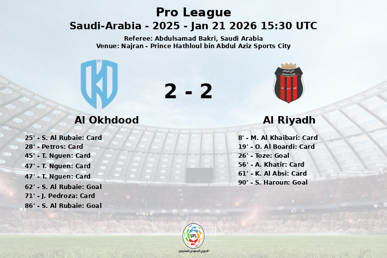 Un match chargé d’émotion et de cartons s’est déroulé au Prince Hathloul bin Abdul Aziz Sports City à Najran, où Al Riyadh et Al Okhdood ont fait match nul dans un match vibrant correspondant à la 17e journée de la Pro League saoudienne.