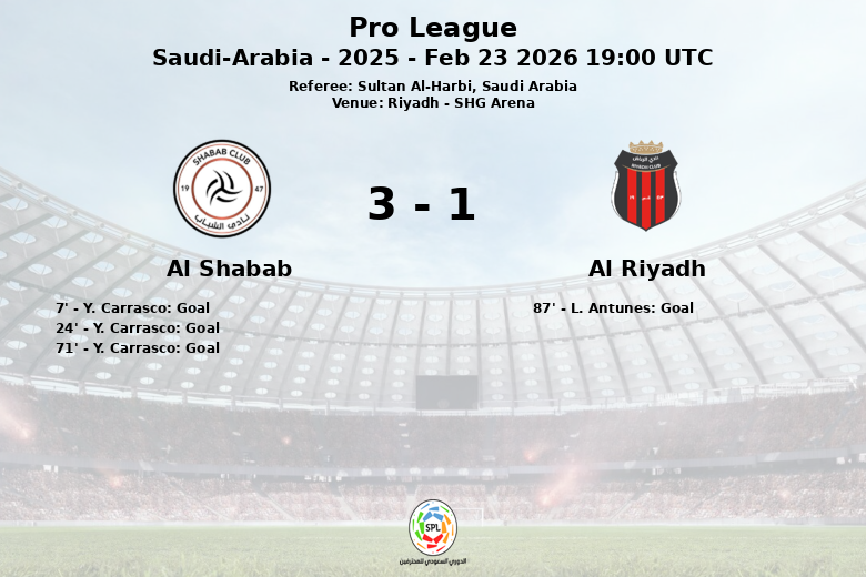En seconde période, Al Shabab a continué à presser, et Carrasco a complété son triplé à la 71e minute, consolidant la victoire de son équipe. Al Riyadh, malgré une plus grande possession et un plus grand nombre de tirs (25 au total, dont seulement 6 cadrés), n’a pas réussi à concrétiser ses occasions. Le but de consolation d’Al Riyadh est arrivé à la 87e minute, avec un but de L. Antunes assisté par O. Al Boardi, mais il a été insuffisant pour changer le cours du match.