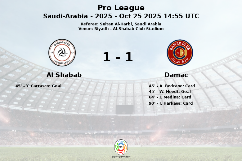 Riyad, le 25 octobre 2025 – Al Shabab a remporté la victoire face à Damac dans un match disputé au stade Al-Shabab Club, comptant pour la sixième journée de la Pro League saoudienne. Le match, arbitré par Sultan Al-Harbi, a été marqué par l’expulsion d’A. Bedrane de Damac juste avant la mi-temps.