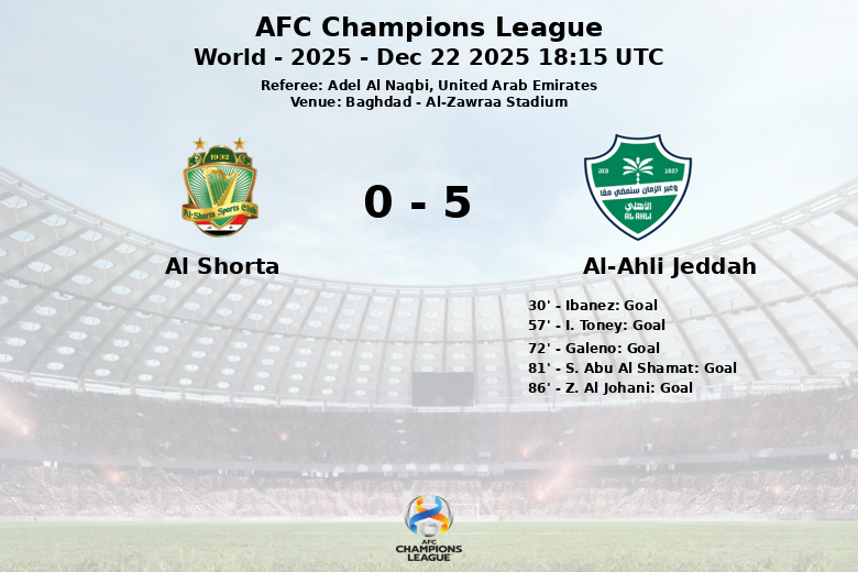 Bagdad, Irak – Lors d’un match disputé au stade Al-Zawraa, Al-Ahli Jeddah a démontré sa puissance offensive en battant de manière convaincante Al Shorta avec un score fleuve. Bien qu’Al Shorta ait dominé la possession du ballon avec 57 %, l’efficacité d’Al-Ahli Jeddah devant le but a été déterminante.