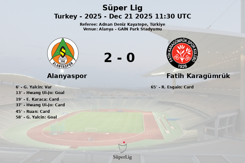 Alanyaspor a ouvert le score à la 13e minute grâce à un but de Hwang Ui-Jo, consolidant sa domination initiale. Cependant, un but précédent de G. Yalcin a été refusé par la VAR à la 6e minute en raison d’une faute. La première mi-temps a également été marquée par les cartons jaunes attribués à E. Karaca (19e) et Hwang Ui-Jo (37e) pour Alanyaspor, et Ruan (45e).