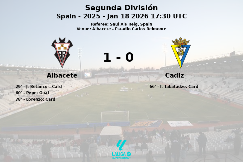 Après la pause, Albacete a réussi à débloquer la situation grâce à un but de Pepe à la 60e minute. Ce but, fruit d’une bonne action offensive, a déclenché l’euphorie dans les tribunes. Malgré ce coup dur, Cádiz a tenté de réagir, mais s’est heurté à une défense d’Albacete bien organisée. Cadix a également reçu un carton jaune pour Tabatadze à la 66e minute. Déjà à la 78e minute, Lorenzo a reçu un carton jaune pour Albacete.